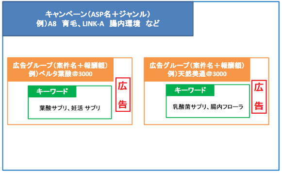「キャンペーン>広告グループ>キーワード・広告」という構造になっています。