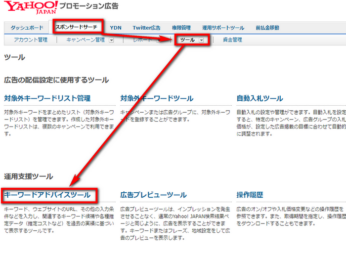Yahooプロモーション広告内のツールでキーワードアドバイスツールという