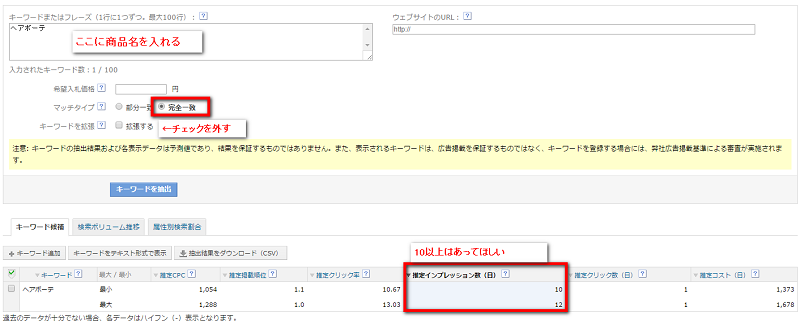 案件選定の基準に検索ボリュームを調べるだけならキーワードプランナーを使う必要はありませんが、関連キーワードに取り組むとなれば想定したキーワードをキーワードプランナーにかけることで事前に状況を把握することが出来ます。